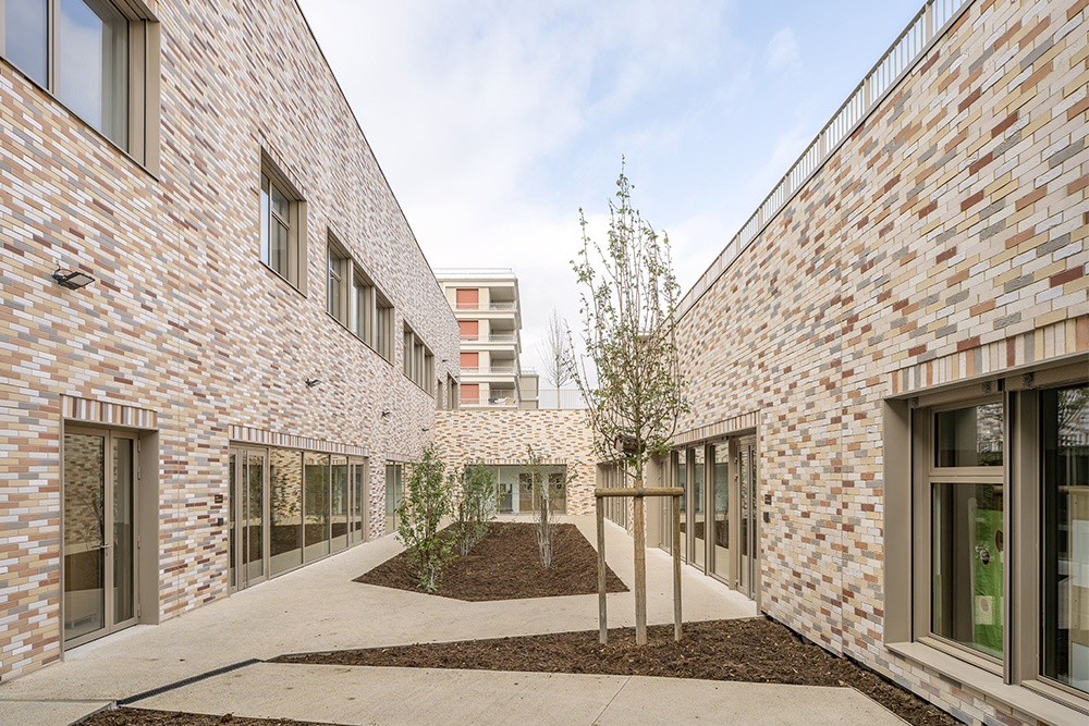 Chaque entité du groupe scolaire dispose d’un fonctionnement propre, avec ses espaces extérieurs de cours et ses locaux partagés. Ainsi, le dispositif des deux écoles est symétrique et installe une certaine rationalité. Cela est indispensable au bon fonctionnement d’un tel établissement. Chaque établissement fonctionne donc de façon automne et compacte autour d’un hall central en double hauteur. Ce dernier permet de distribuer l’ensemble des locaux de chaque école.