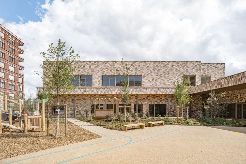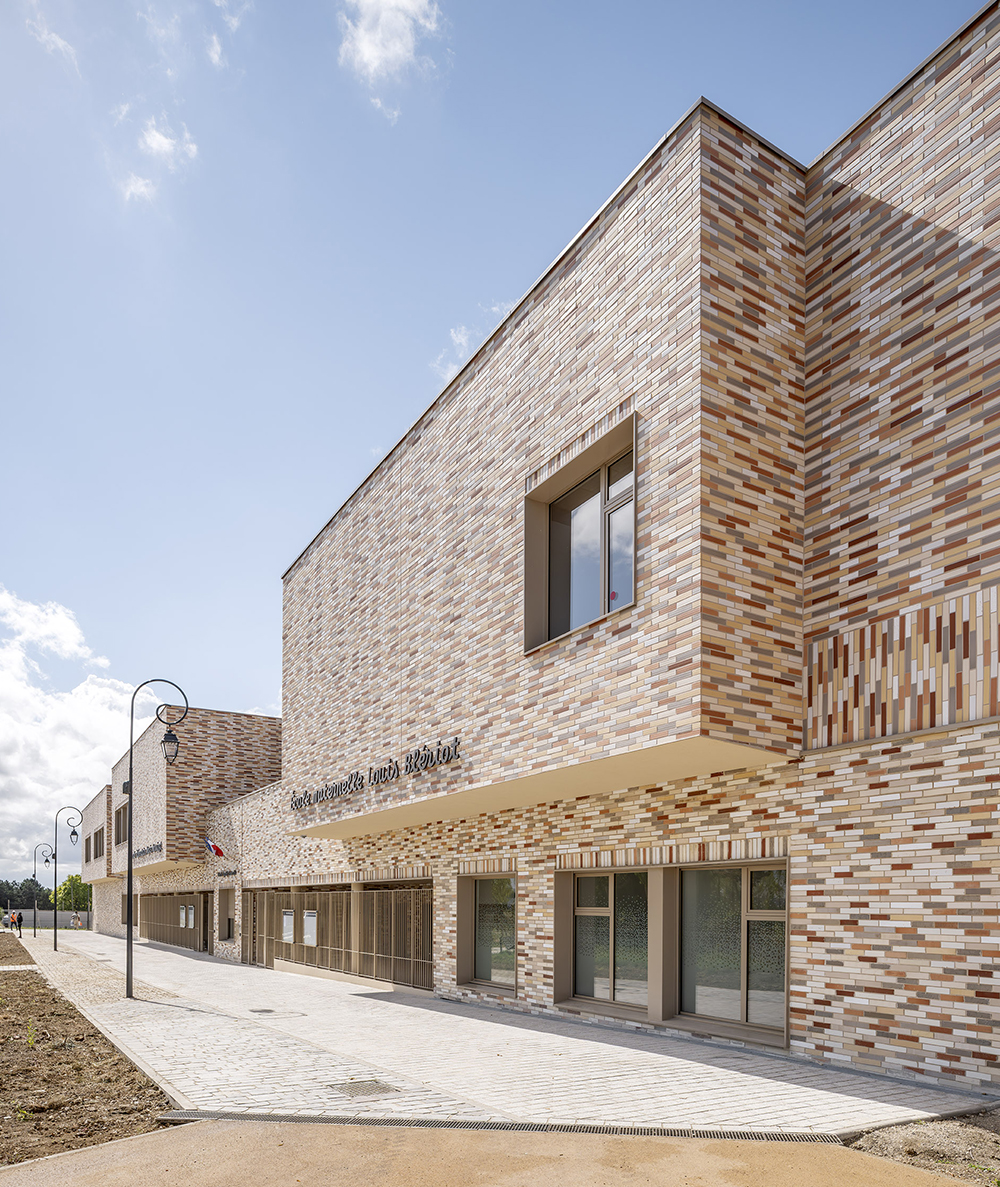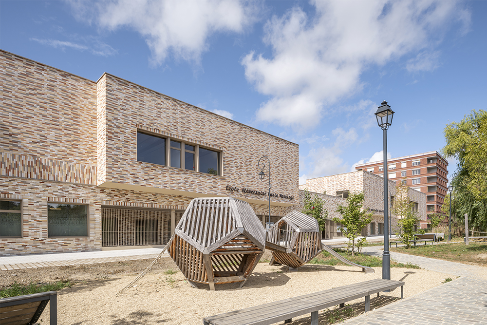 Nous avons imaginé cet établissement comme un monolithe minéral percé, ponctué de prismes soulevés. Afin de répondre aux objectifs programmatiques, environnementaux et urbains ambitieux du programme, trois thématiques se détachent. D’abord, affirmer dans le quartier la présence d’un nouvel équipement public grâce à une écriture contemporaine et sobre, s’intégrant harmonieusement à son environnement immédiat. Ensuite, proposer un fonctionnement optimum et efficace pour le nouveau groupe scolaire, afin de hiérarchiser les lieux et aider les enfants à s’orienter dans le bâtiment. Enfin, définir une stratégie pertinente de conception architecturale et technique à faible impact environnemental.