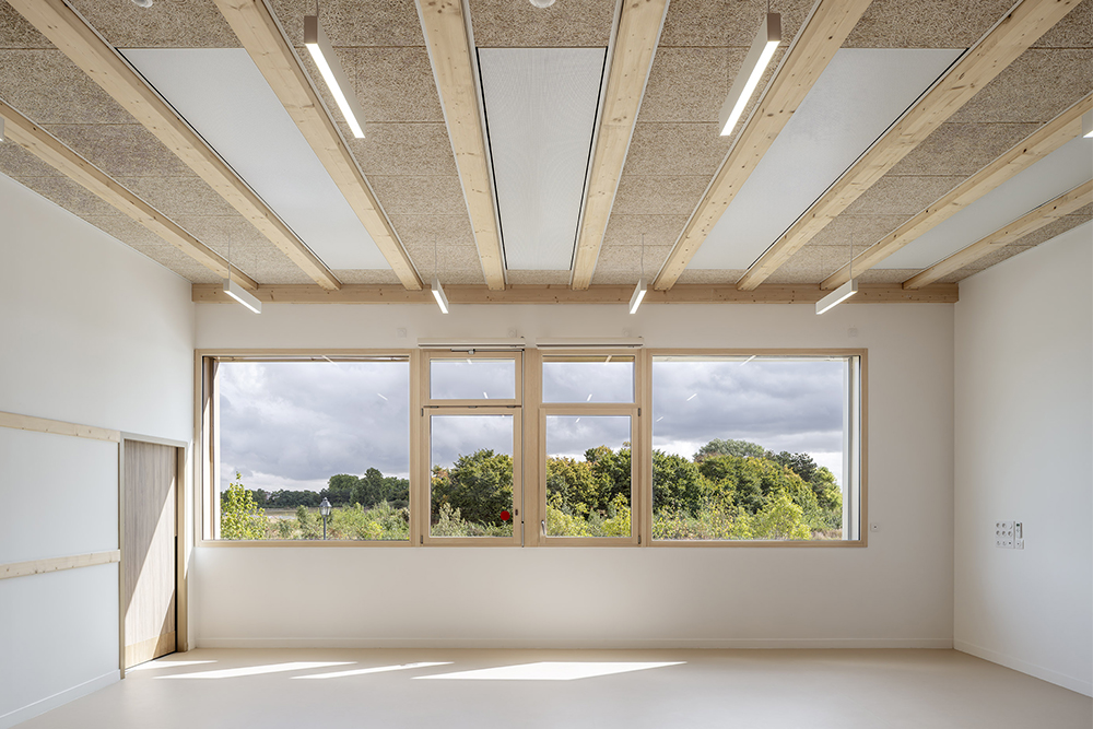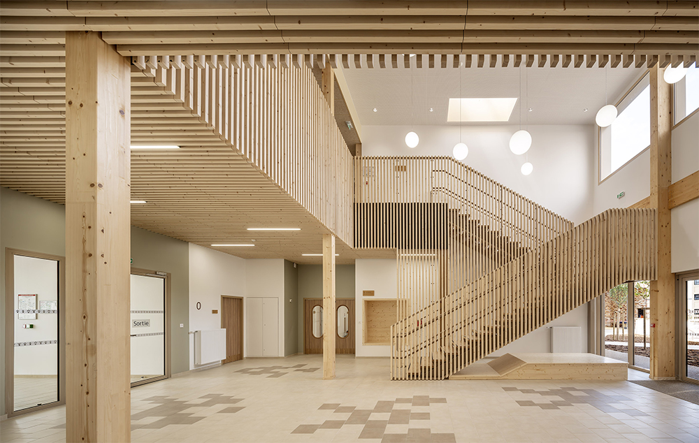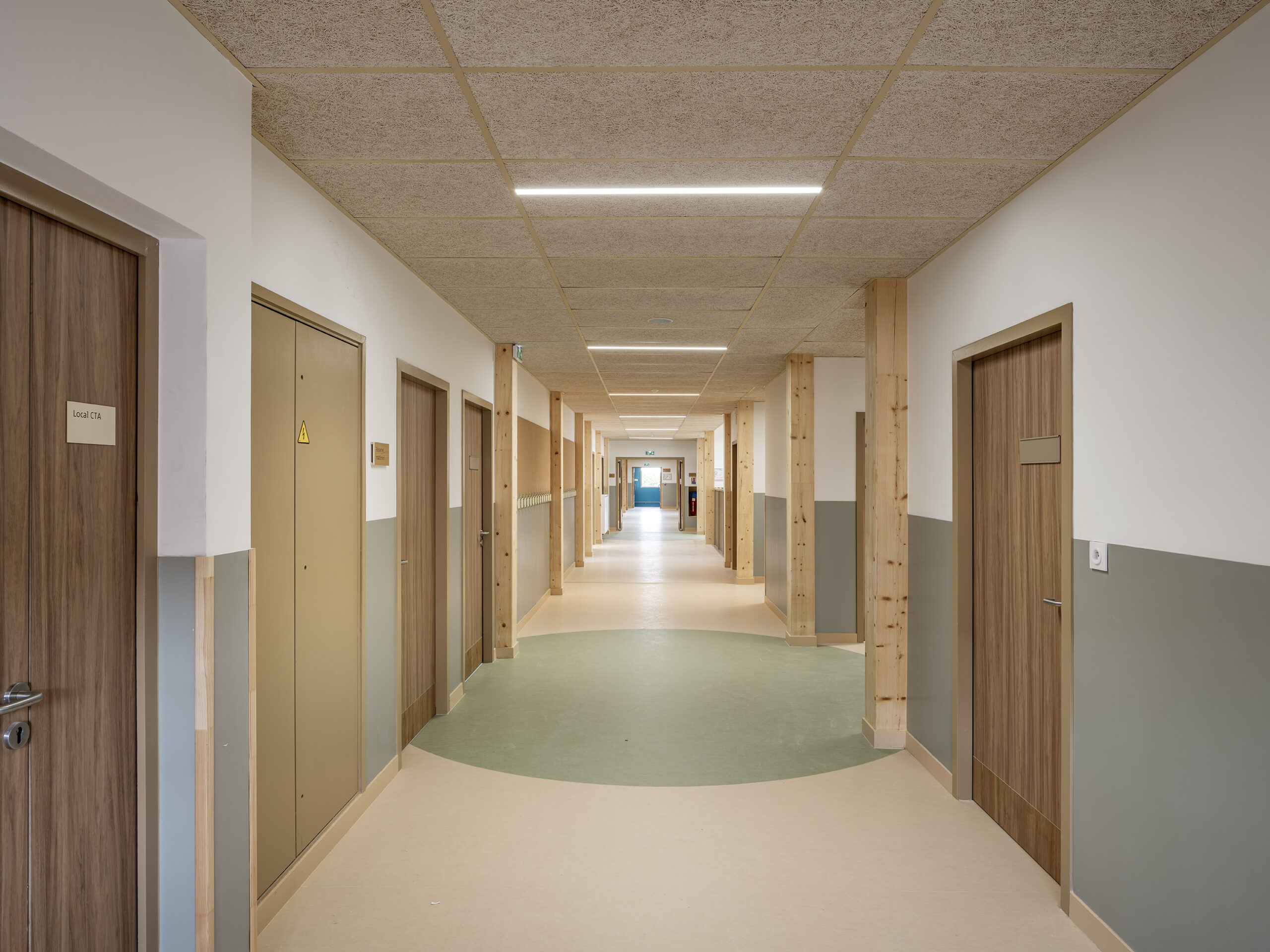 La restauration, implantée au cœur du dispositif, donne sur un large patio planté. Cela permet une organisation fluide des autres espaces à rez-de-chaussée : salles polyvalentes, accueil périscolaire, direction et salles des maîtres. L’étage est équipé d’une circulation centrale confortable autorisant une bonne surveillance et le passage aisé des flux d’élèves. De plus, les classes sont disposées de part et d’autre de la circulation. Elles sont régulièrement éclairées naturellement par de larges lanterneaux implantés en toiture. Les cours de recréation sont au rez-de-chaussée, de plain-pied depuis les halls. Cela leur permet de bien s’intégrer dans la pente naturelle du site.