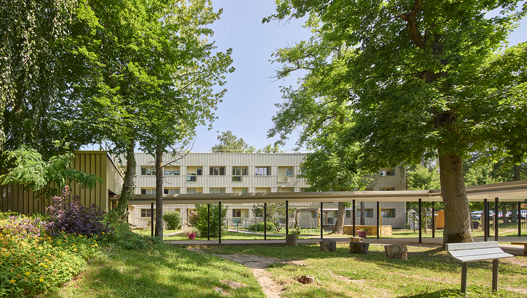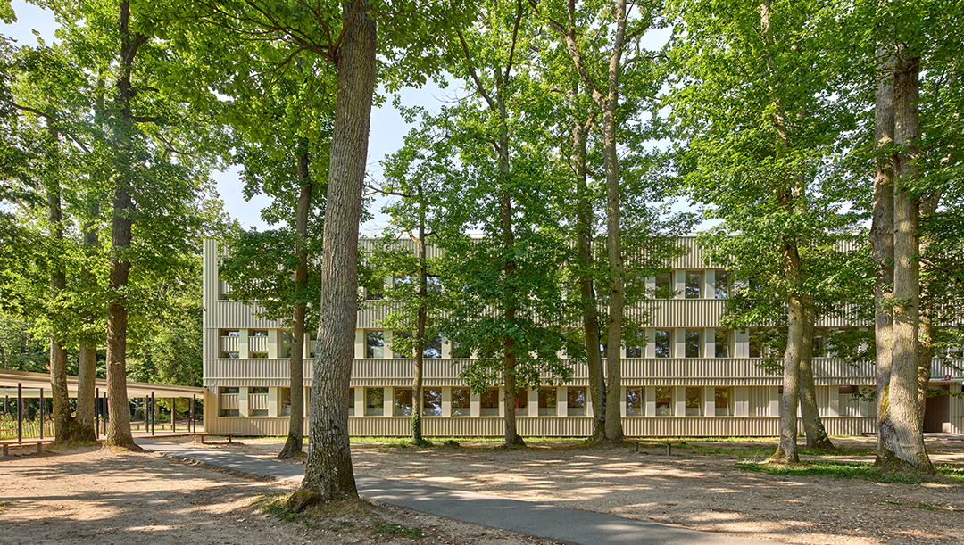 Tous les éléments du projet sont conçus de façon à intégrer les différentes constructions dans son environnement proche, en répondant avec des matériaux et teintes chaudes en accord avec la nature, ainsi que le renfort de la trame verticale, qui répond à la trame des arbres à haute tige, multi-présents dans le site.