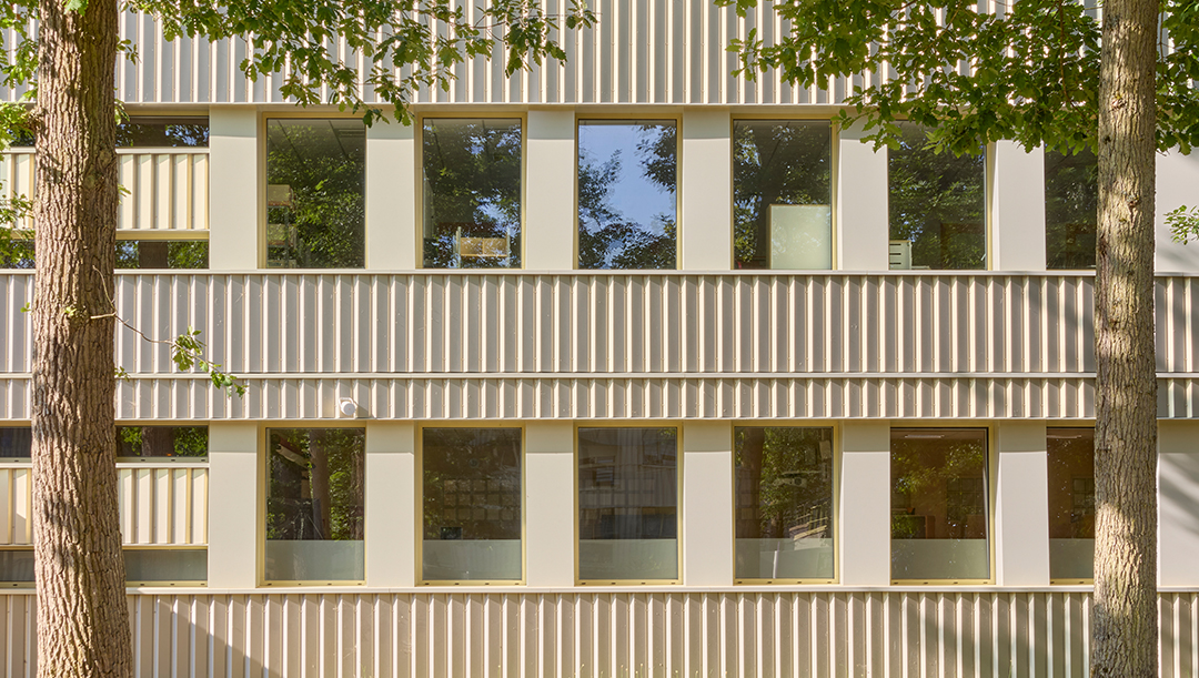 L’ensemble des façades seront habillées en bardage métallique avec une teinte irisée, qui évolue en fonction de la lumière ; le préau est habillé d’un bardage bois, qui permet de donner une ambiance chaleureuse à l’espace abrité.